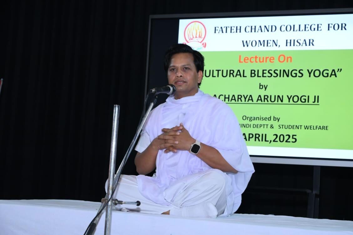 हिसार के प्रसिद्ध कॉलेज, फतेह चंद कॉलेज फॉर वूमेन द्वारा अन्तर्राष्ट्रीय योग-गुरु श्री अरुण योगीजी को निमंत्रित किया गया।श्री योगीजी का दिव्य-भव्य स्वागत और अभिनंदन कॉलेज परिसर में कॉलेज के अध्यक्ष श्री रामकुमार रावलवासी जी ने अपने कमेटी के अधिकारियों, पदाधिकारियों, प्राचार्या एवं आचार्यों समेत किया। कार्यक्रम की शुरुआत सरस्वती वंदना से हुई। आप पूज्य आचार्यश्री रूपचन्द्र महाराज के शिष्य हैं और आप 30 वर्षों से उनके ही सान्निध्य में योग-ध्यान-साधना द्वारा अपने को सिंचित कर रहे हैं। श्रीयोगीजी ने विश्व की सबसे लघु (छोटी) यौगिक क्रिया, “ब्रह्म क्रिया” का सृजन किया है। श्री योगीजी ने उपस्थित सभी लोगों प्राचार्या,आचार्यों, एवं विद्यार्थियों को “ब्रह्म क्रिया” सिखायी एवं ध्यान करते वक्त क्या ग़लतियाँ करते हैं जिससे योग करने के बावजूद भी परिणाम नहीं आता है ऐसी गलतियों को सुधारा। पूरा ऑडिटोरियम खचा खच भरा हुआ था। योग कार्यक्रम में सभी विद्यार्थियों ने बहुत उत्साह दिखाया एवं कई प्रश्न भी पूछे। मानव मंदिर गुरुकुल की छात्रा दिव्या के “गुरु वंदन” प्रस्तुति ने सबके मन को मोह लिया। कार्यक्रम के मध्य में सुश्री दिव्या ने गुरुदेव जी द्वारा लिखित भजन “प्रेम हमारी साधना” की प्रस्तुति दे कर समा बांध दिया। श्रीयोगीजी ने मानव मंदिर संस्था के अंतर्गत चल रहे विभिन्न प्रकल्पों की जानकारी भी दी। प्रख्यात ज्योतिषविद् श्री पी. के शास्त्री जी ने अपने उद्बोधन में ज्योतिष-विज्ञान पर चर्चा की।